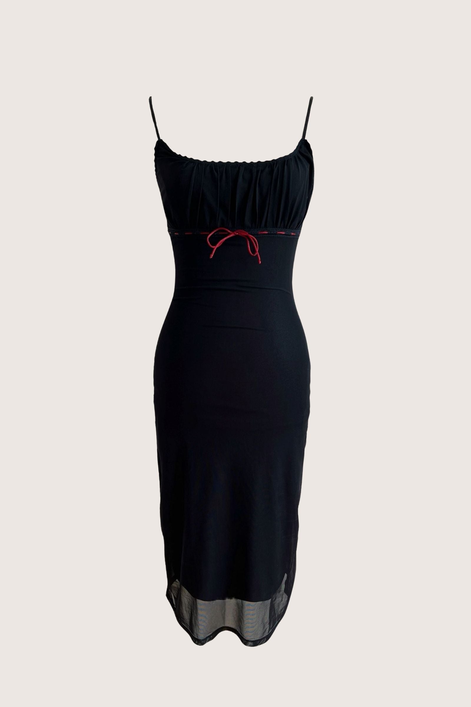 This 1990's black slip dress features a ruched bust & a darling red ribbon detail. A classic staple that can be styled in so many ways, meant to be treasured forever.