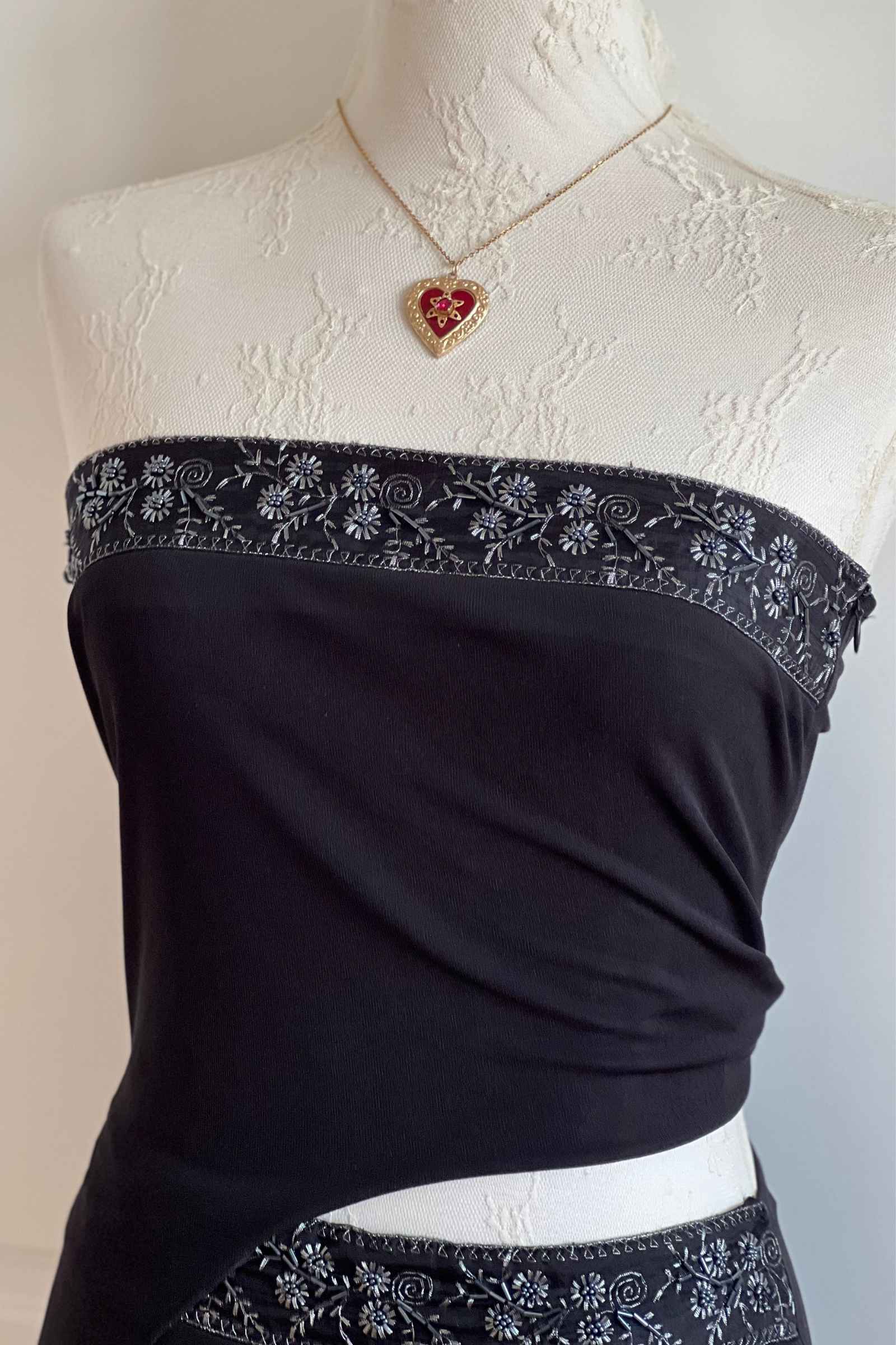 This 1990's black tube top & skirt ensemble features delicate beading details and asymmetrical cut-outs. A feminine vintage piece, meant to be treasured forever.