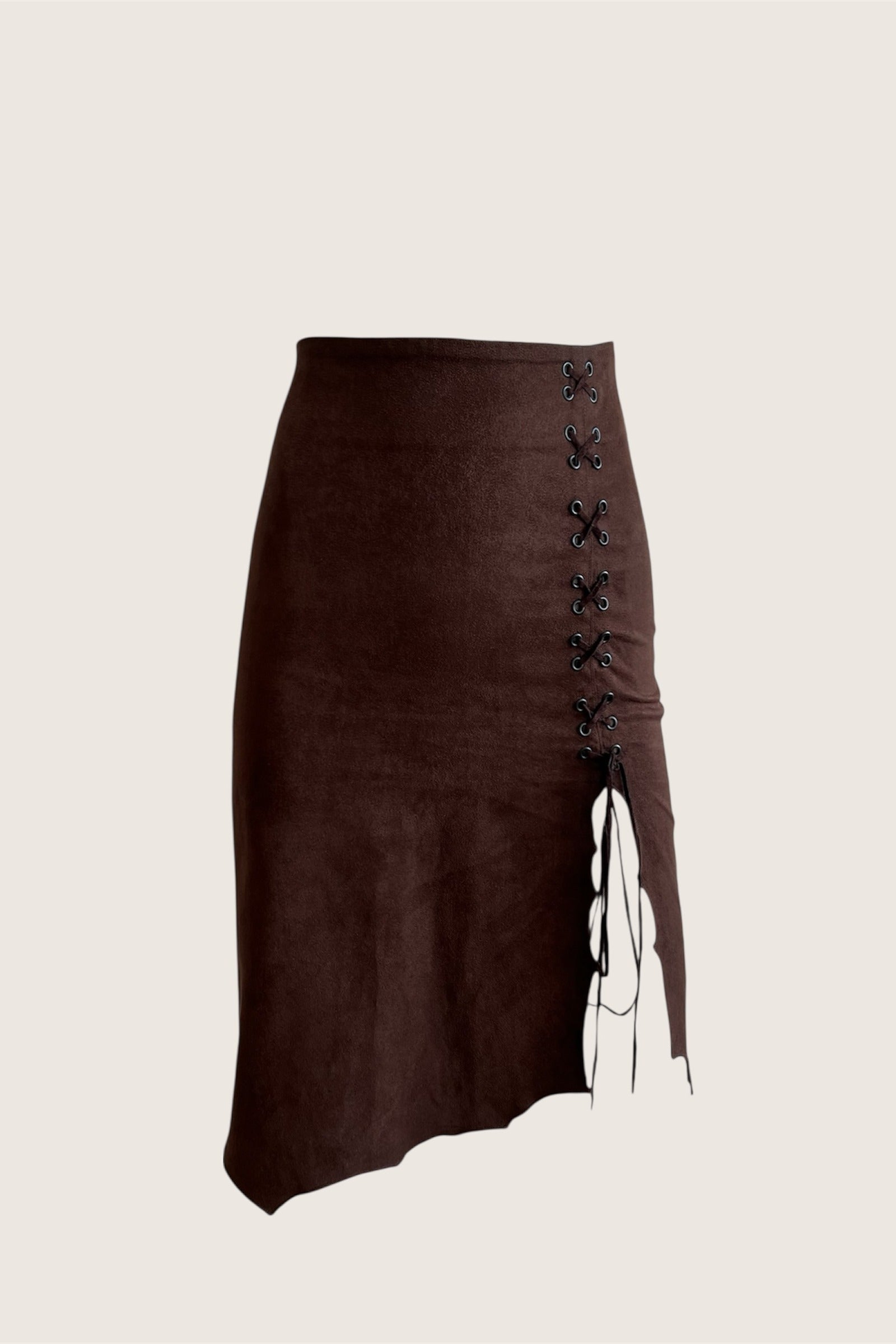 The most unique faux suede lace-up chocolate brown skirt from the 1990s. A closet staple perfect for the fall and winter seasons, that can be styled in endless ways — meant to be treasured forever.