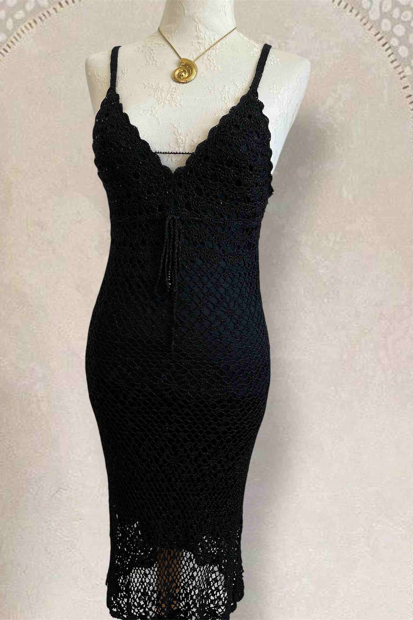 This black midi crochet dress features a scalloped neckline, a netted hem & is fully lined.