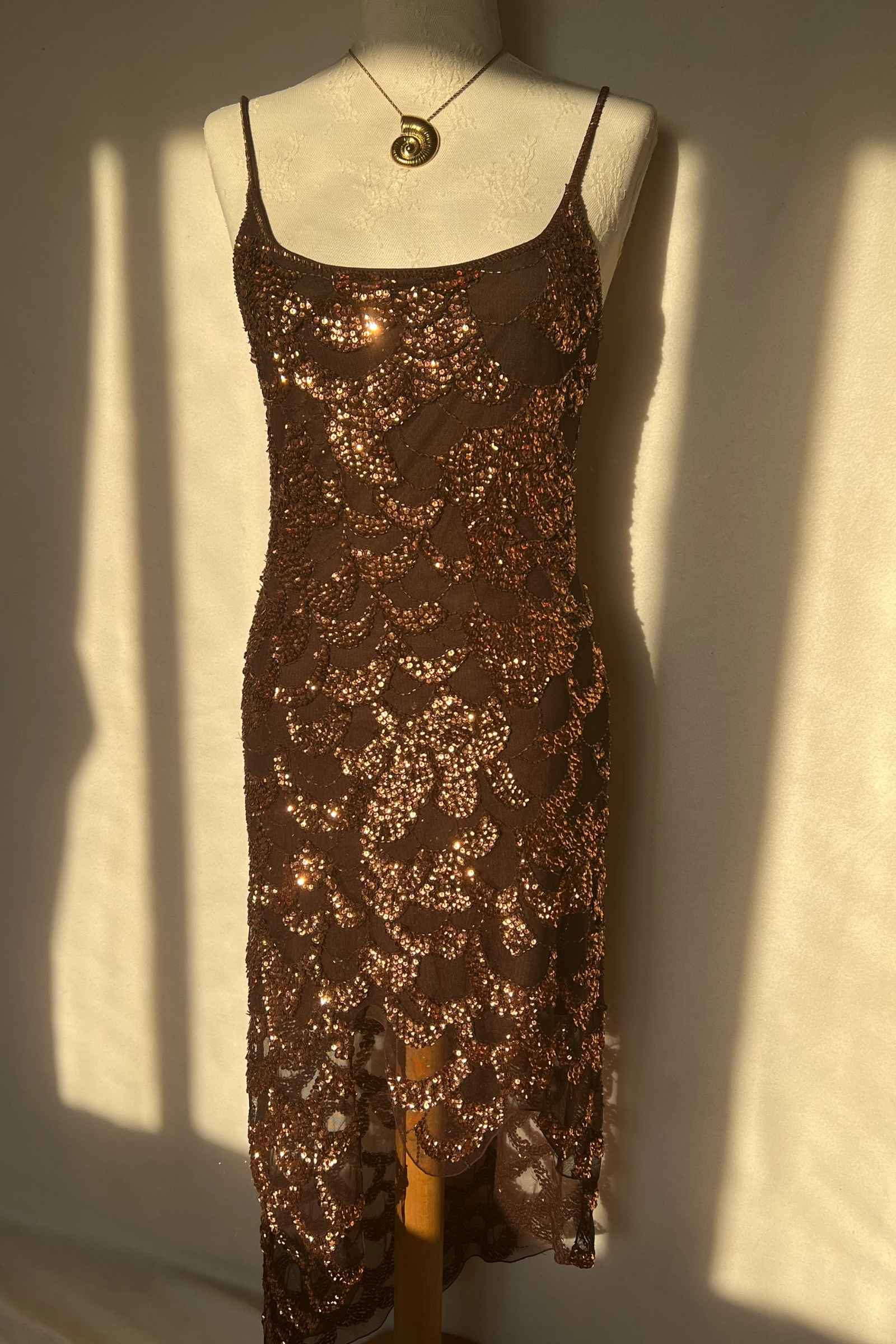 Vintage Bronze Sequin Scalloped Dress & Scarf Ensemble