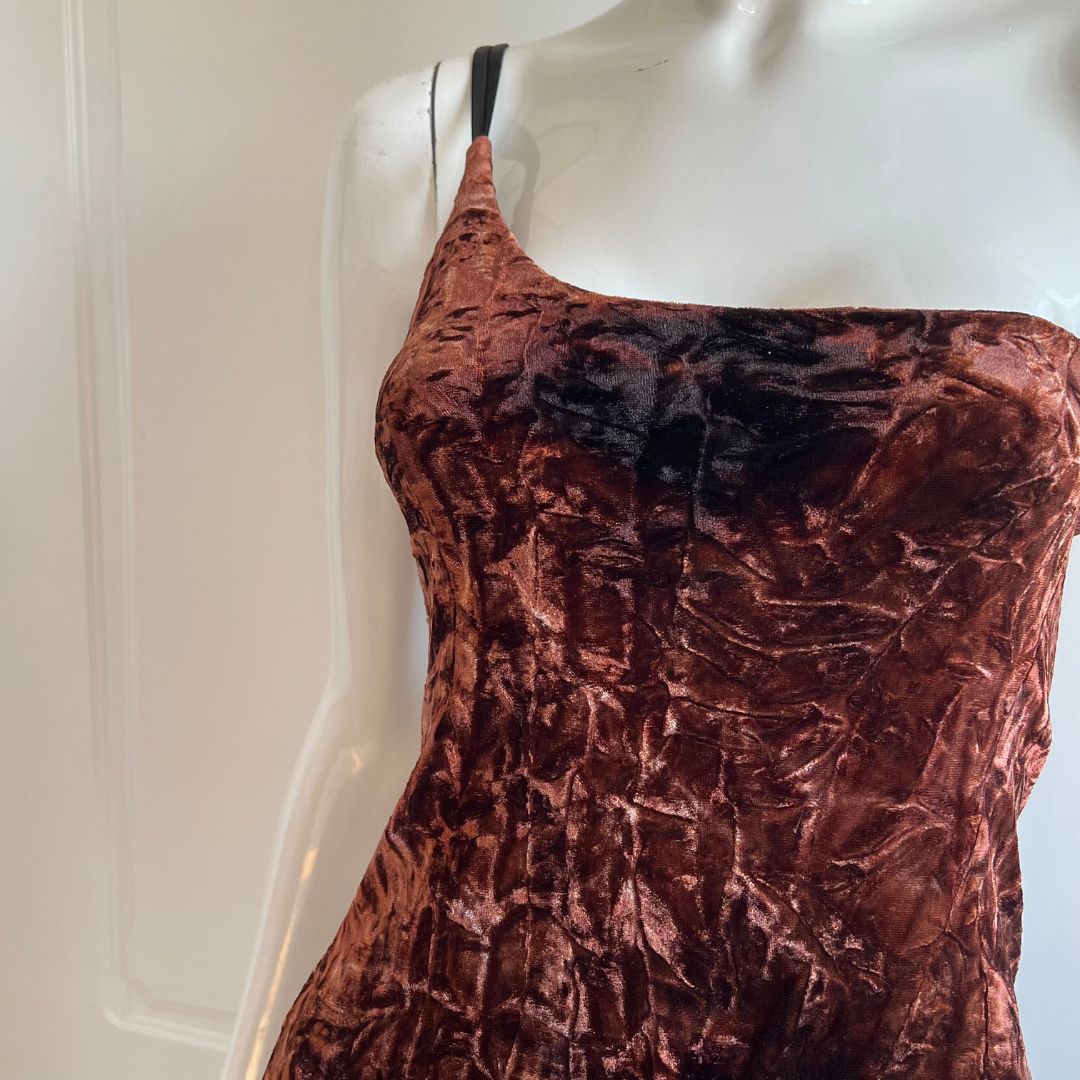 The most unique chocolate brown slip dress featuring a crushed velvet effect & one-shoulder detail. A vintage piece perfect for the fall and winter seasons, meant to be treasured forever.
