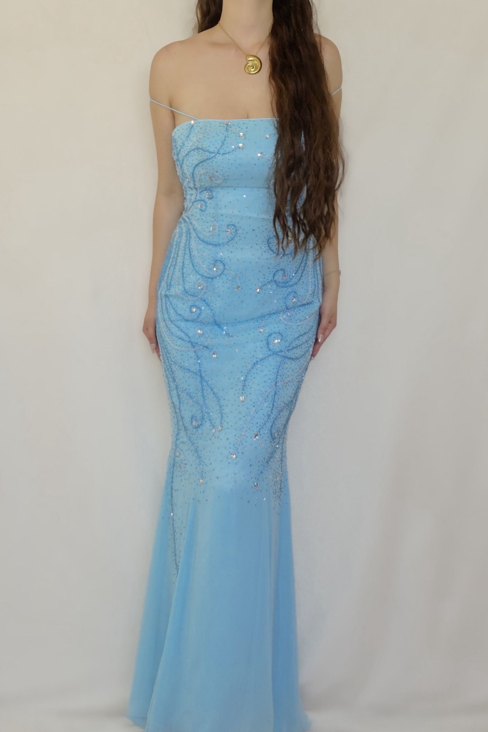 A romantic sky blue vintage beaded gown that features delicate spaghetti straps, meant to be treasured forever. True color is shown in the mannequin photo.